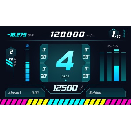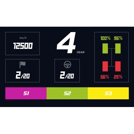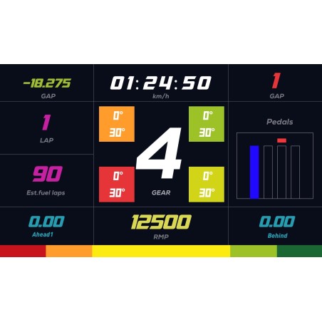 Ce dashboard HD peuvent afficher une variété d'informations, telles que la vitesse, les tours, la température du moteur, la pression des pneus, le carburant restant, les paramètres moteur, et bien plus encore. Ces données sont similaires à ce que l'on retrouverait sur le tableau de bord d'une voiture de course réelle.